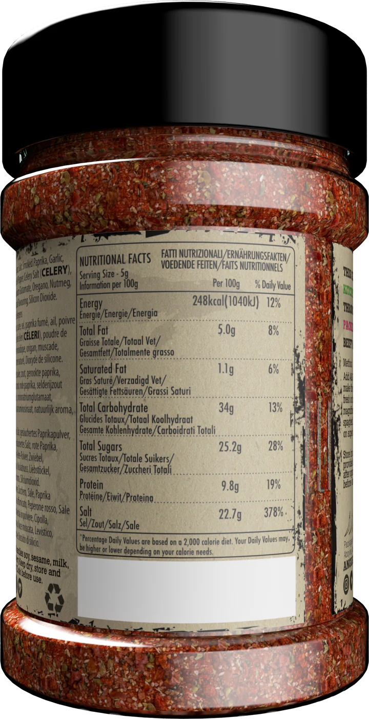 Ingrediënten: Zout, gedehydrateerde knoflook en ui, bruine suiker, paprika, suiker, kruiden, dinatriuminosinaat en dinatriumguanylaat, natuurlijk hickoryrookaroma.